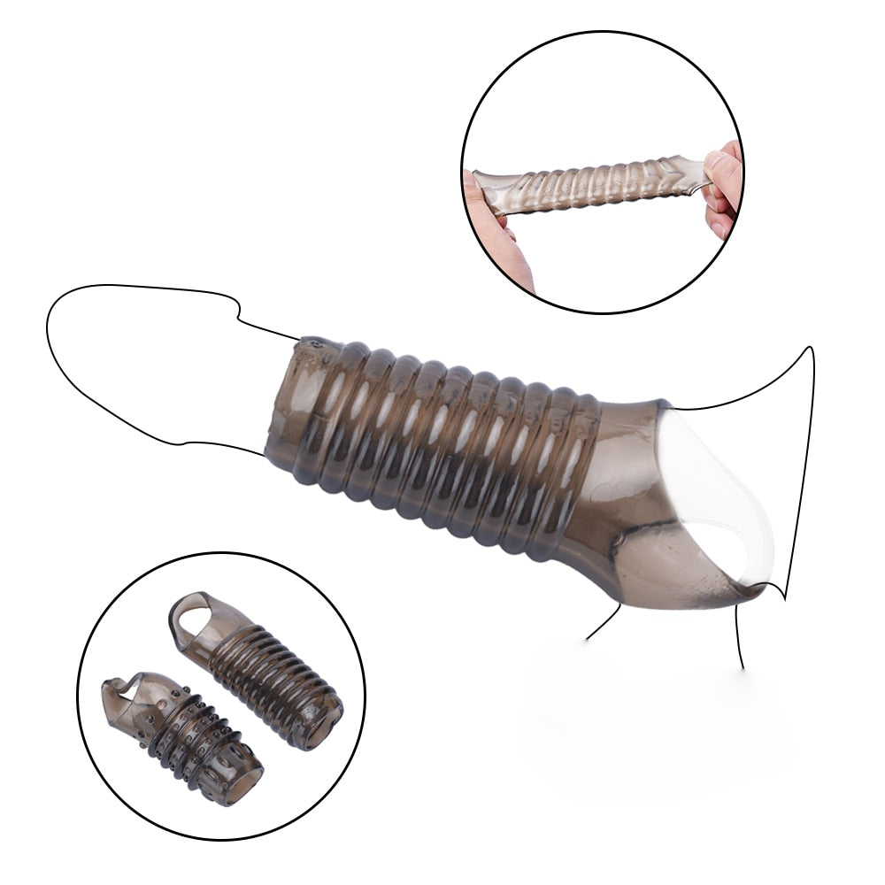 ปลอกสิลิโคนใสสีดำ แบบปลายเปิดสำหรับสวมลำ สามารถล็อคตรงฐานพวงได้ใส่แล้วรัดแน่นไม่หลุดง่าย ยืดหยุ่นได้สำหรับทุกขนาด ลายบนปลอกเพิ่มความฟินให้ฝ่ายรับ
